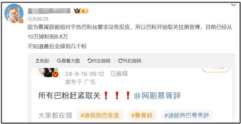 要知说念一直抒发不悦的可不是网友,而是热巴粉丝,因为对热巴新剧妆造不沉静,热巴粉丝大闹剧方辩论区,还到黄晓明、祝绪丹、张云龙等明星辩论区“维权”,条目他们督促剧方整改,给热巴换妆容、换发型、换妆容。